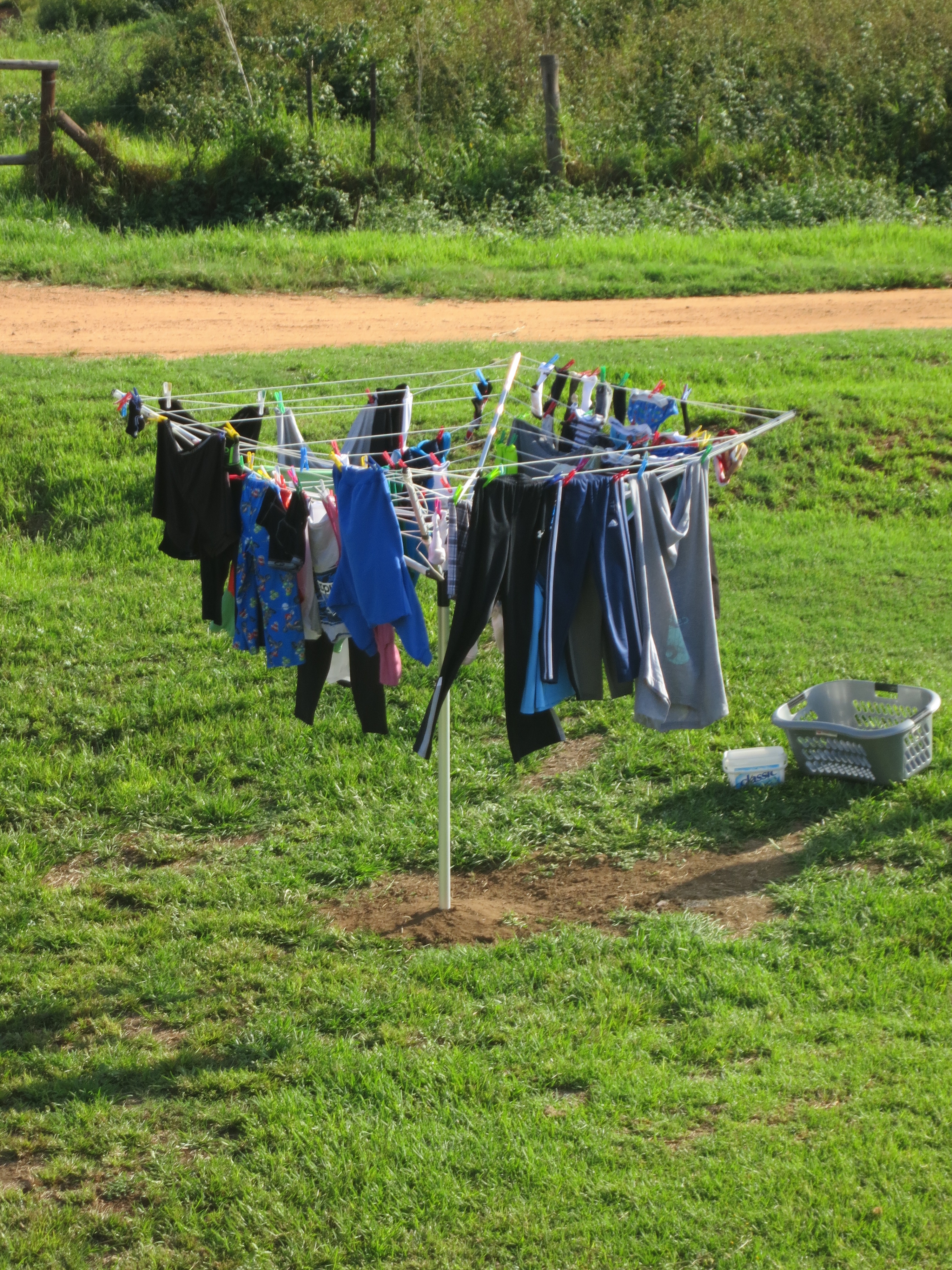 I have had a hard time getting our whites really white with all of this sandy reddish soil (or maybe it’s because we have 4 boys).  So, now I boil our whites on the stove with soap and baking soda for 30 minutes and then wash them in the washing machine.  I have grown to LOVE hanging our clothes on the line and am amazed at how fast everything dries!!