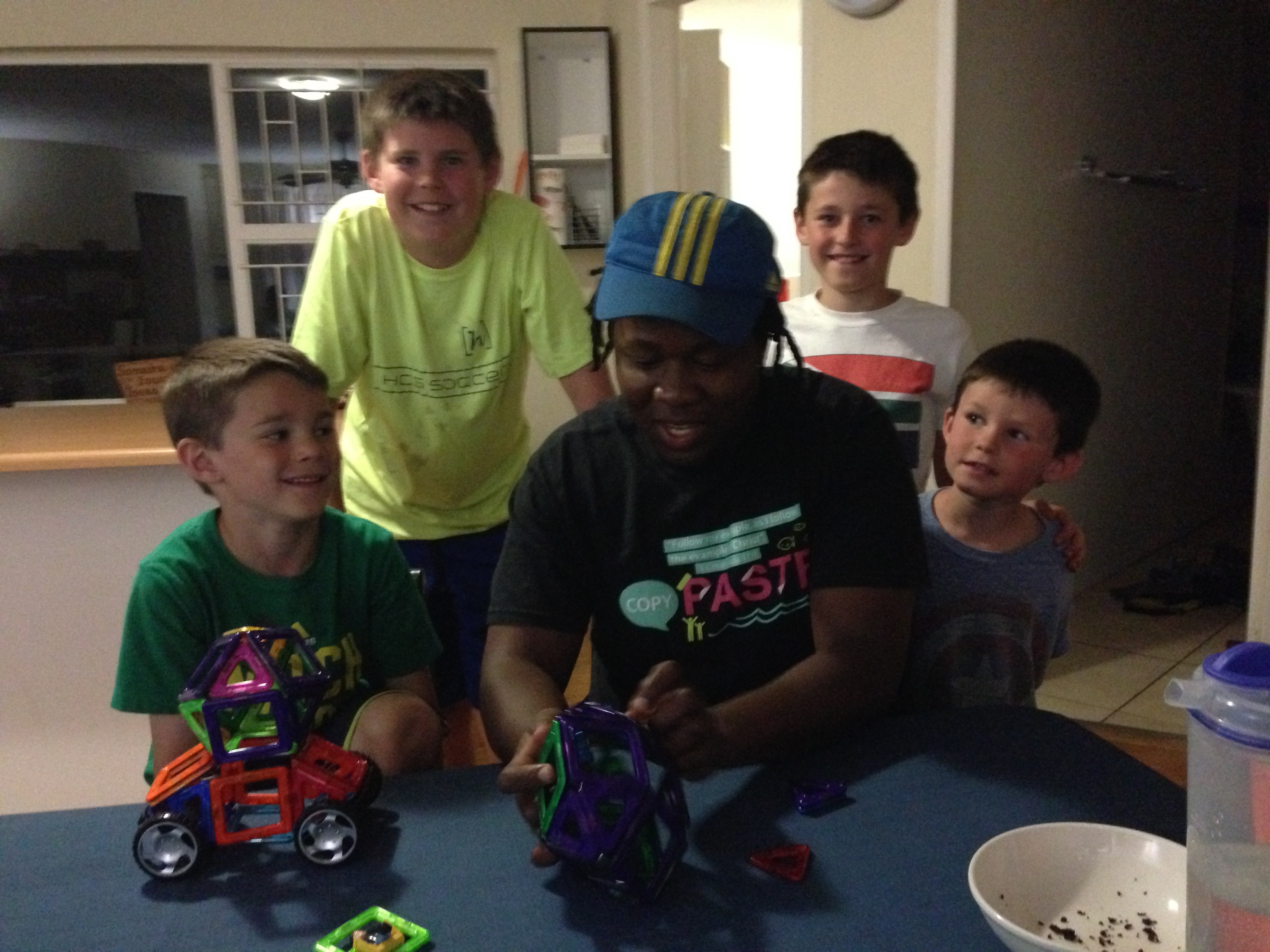 We have had the opportunity to invite people over for dinner, which is such a treat.  I really love cooking and preparing food and sharing a meal with friends…unfortunately this is the only picture I snapped with our dinner guests.  This is Sydney and he has been around for as long as we have been coming here, and he works on the farm.  They boys loved showing him all of the things they have made with their magnets.
