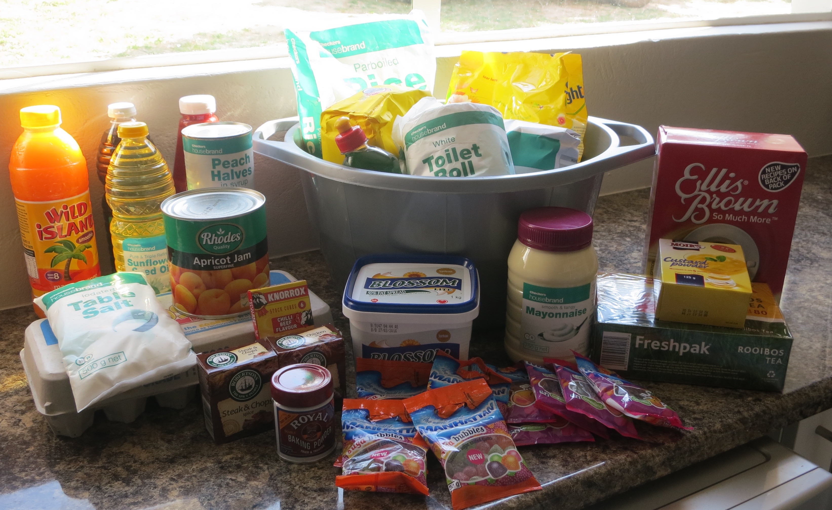 Each basket will include: mayo, toilet paper, soya, tomato sauce, sugar, flour, vinegar, coffee creamer, oil, salt, fruit drink concentrate, rice, dish soap, butter, apricot jam, spices, canned beans and peaches, eggs, powder custard, tea bags, baking powder, detergent and a few sweets for the kids.