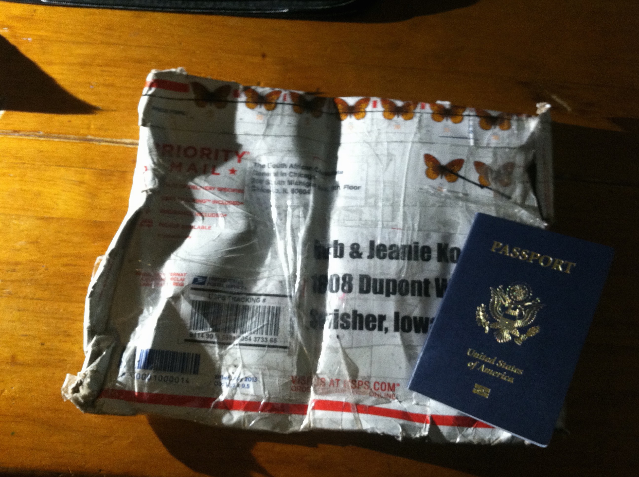 Rob opened the package at the post office in Cedar Rapids, as it seemed a lot lighter than it should to have paperwork and 6 passports in it.